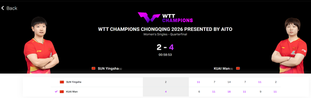 WTT重庆冠军赛女单1/4决赛,孙颖莎2-4不敌蒯曼止步八强,六局比分:11-6、7-11、14-16、7-11、9-11、2-11。随着孙颖莎的出局,在重庆站女单世界前四都已经出局:孙颖莎、王曼昱、陈幸同、朱雨玲。(蒯曼正好是女单世界第五)